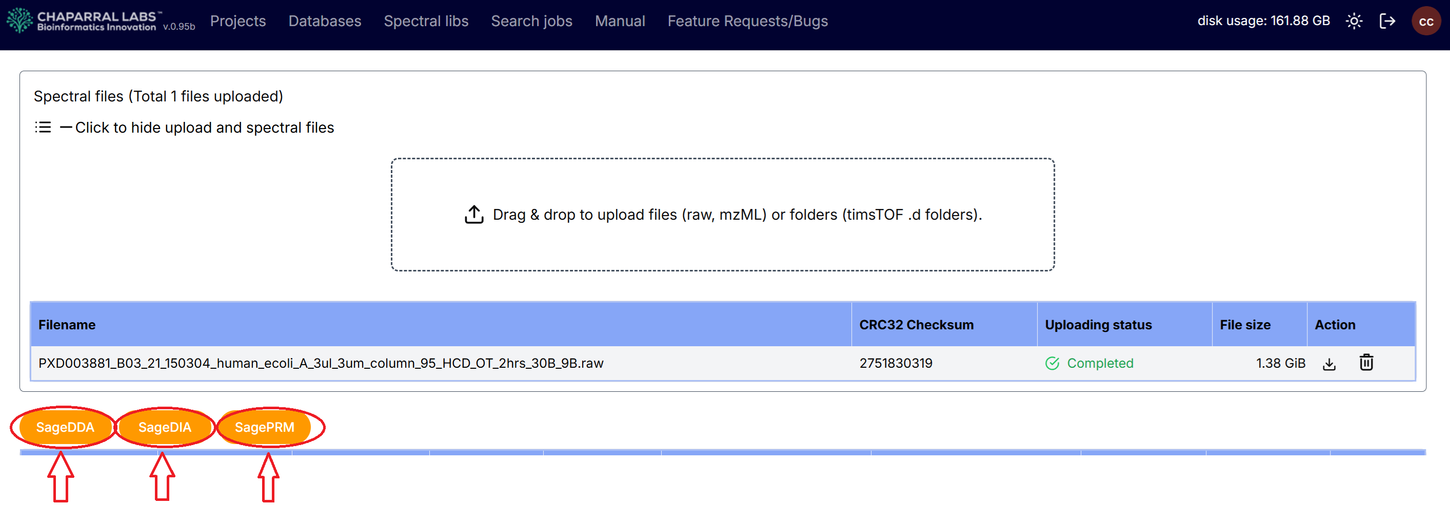 After an experiment has been created, and raw spectral files have been uploaded to the experiment, SageDDA, SageDIA or SagePRM analysis can be selected.