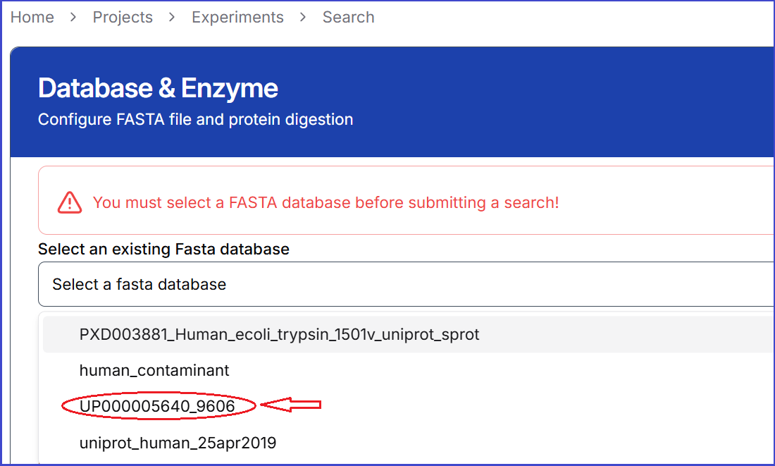 Click database tab. From 'Select a fasta database' dropdown menu, select a fasta file to search.
