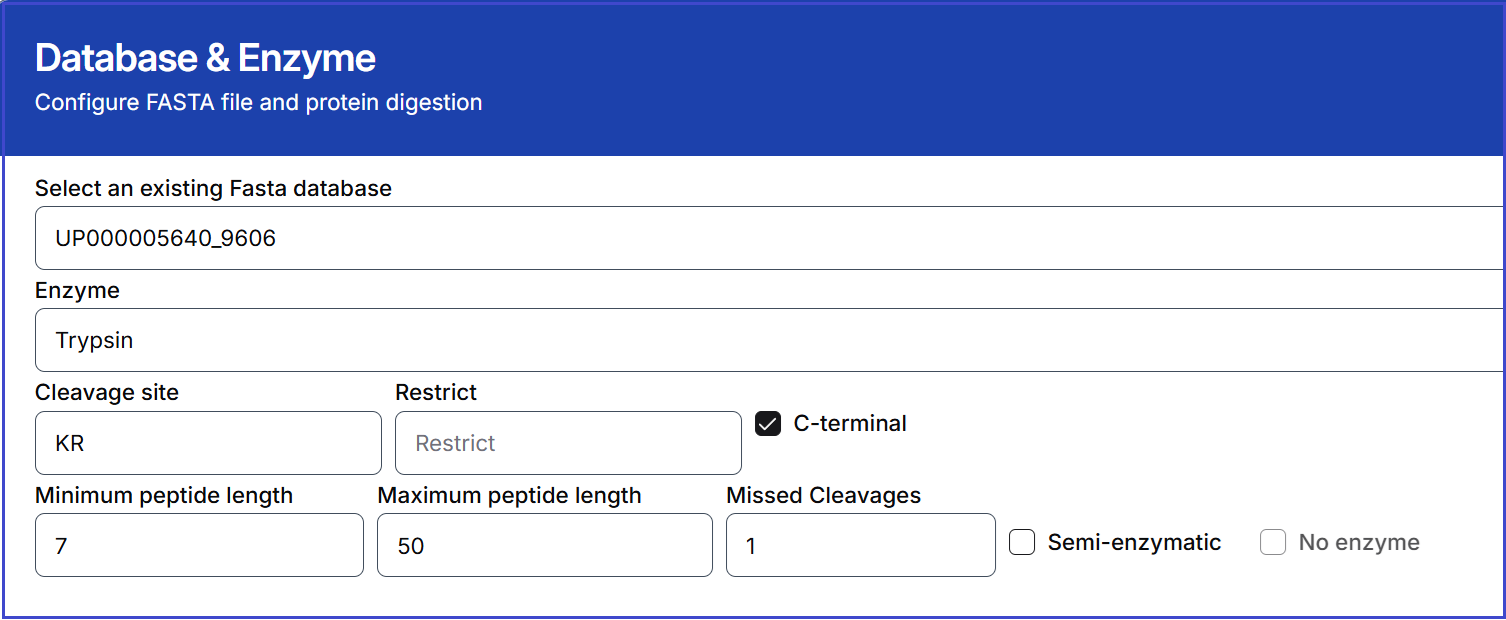 Click the enzyme dropdown menu to select an enzyme. Users can also select custom and specify the cleavage sites and restrictions. Select the range of peptide length and internal mis-cleavage. By default, it searches both ends unless the semi-enzymatic option is selected.