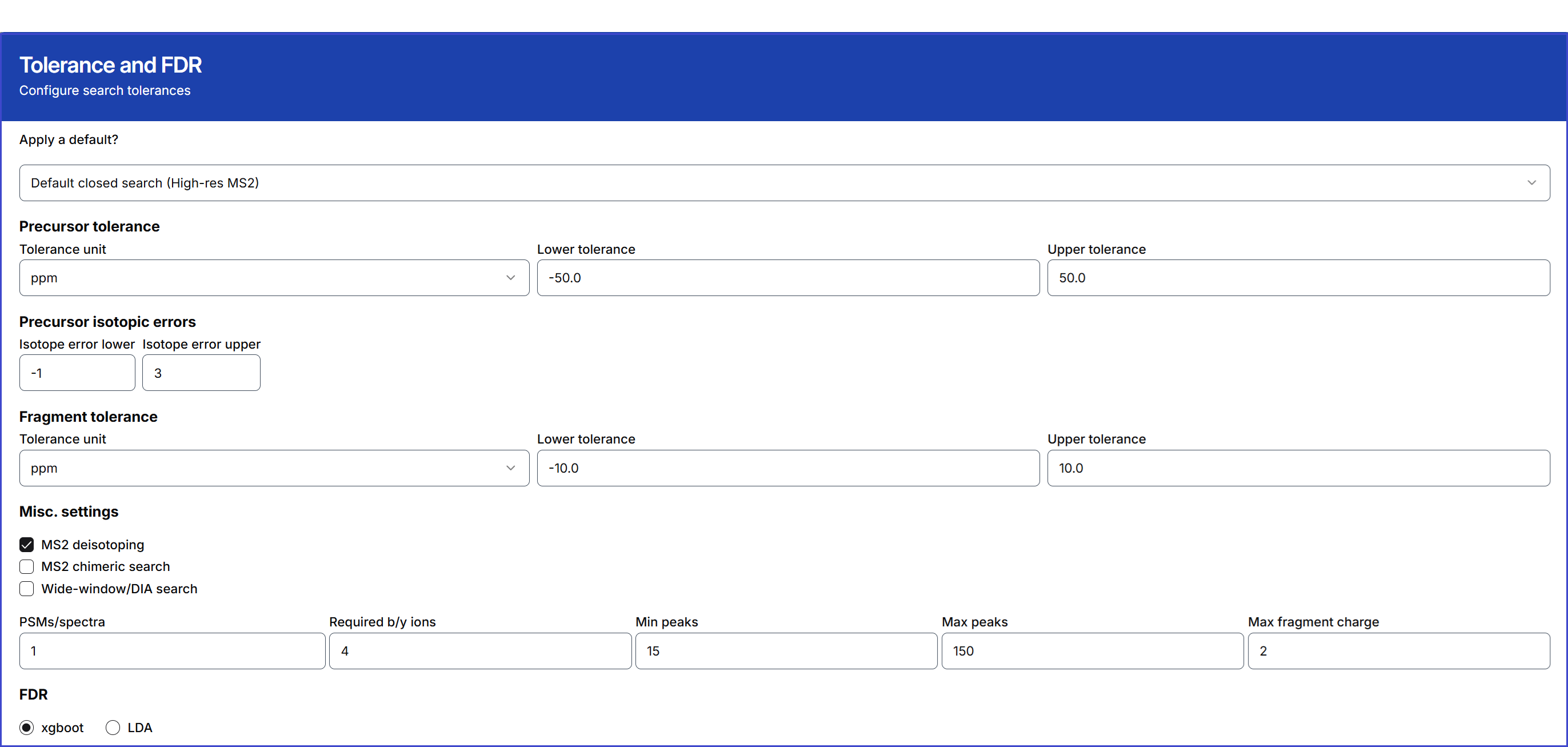 The mass tolerance unit offers options for ppm and Da for both precursor and fragment ions. It also provides chimeric search and wide-window DIA search options.