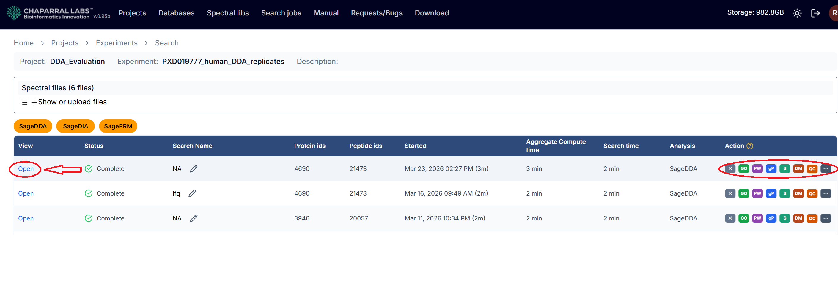 Click on an experiment, and then click on 'Open' link in the "View" column to view the results. Functional analysis, such as Gene Ontology(GO), Pathway Analysis(PW), g:Profiler enrichment(gP), STRING interaction network(S), DepMap(DP) and Quality Control(QC) can also be found on the right hand side of each search entry.