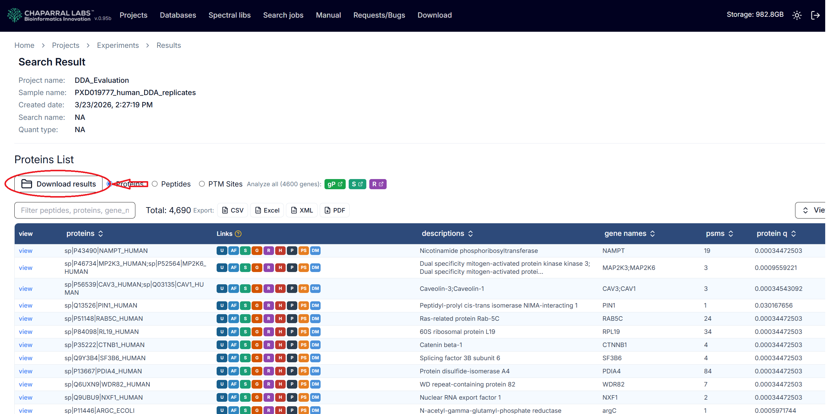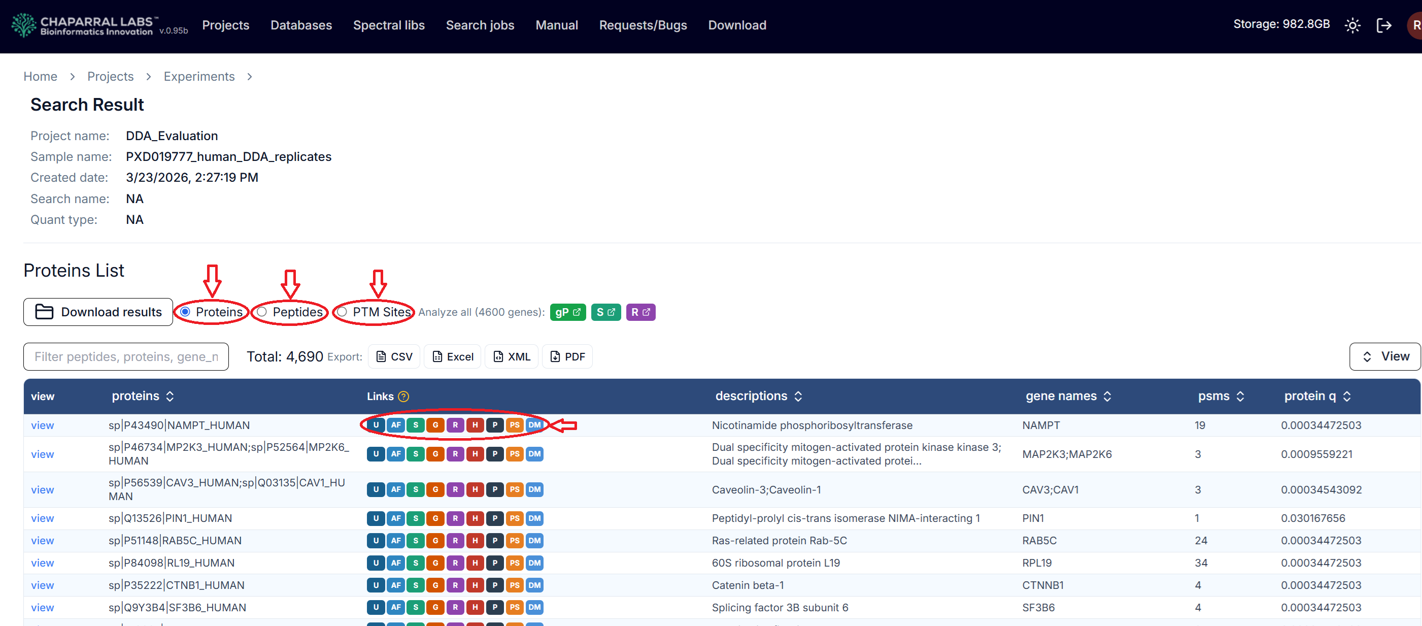 By default, it displays the protein table. Clicking the 'Peptides' radio button will display the peptide table, and 'PTM Sites' radio button to display PTM table. In the 'Links' column, there are links to various external resources, such as UniProt, Alpha Fold, Gene Cards for each protein entry.
