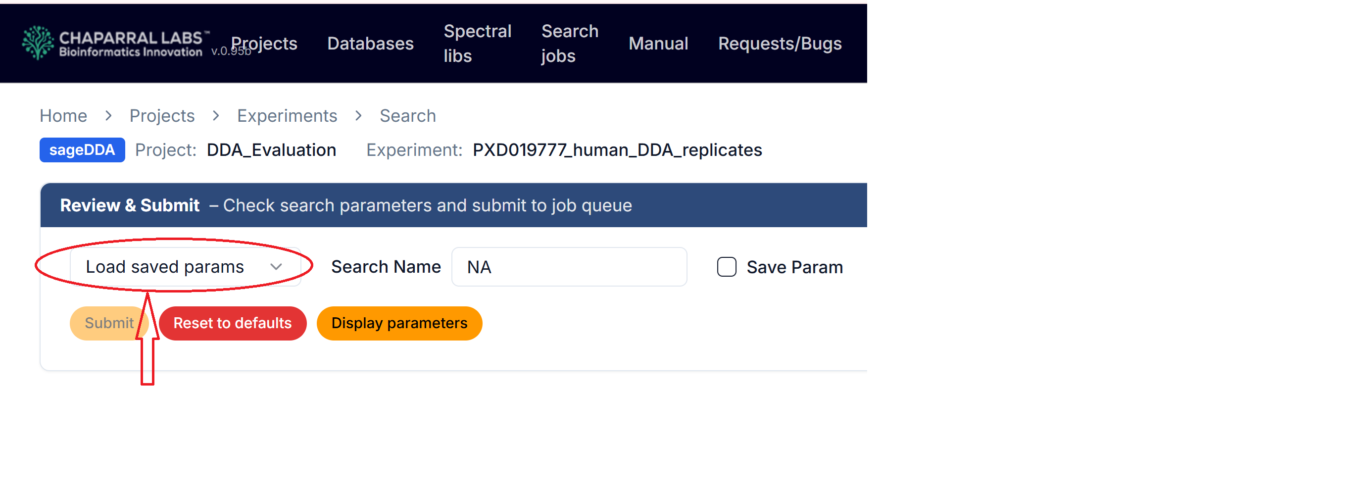 10. Submit SageDIA Search10.1 Select an existing parameter fileSelect parameter file You can select an exisiting parameter json file for the search, or specify the parameters from scratch. 10.2 Spectral Library & Params